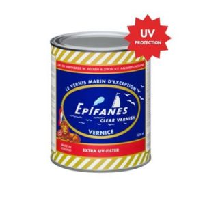 Le vernis contient un filtre UV haute qualité. Cependant pour une utilisation extérieure avec une extra protection UV, il est conseillé de recouvrir par 2-3 couches d’Epifanes Vernis poly-uréthane brillant ou Epifanes Vernis marin brillant.